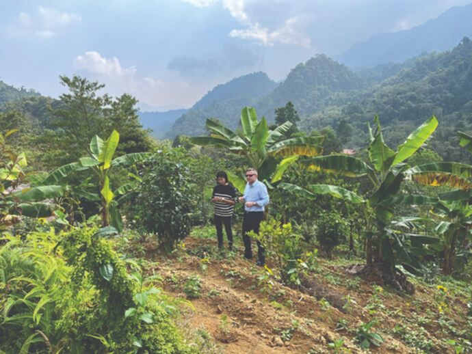 | Edgar Doerig, représentant régional pour l’Asie et le Pacifique de l’OIF, accompagné par Dinh Thi Huyên, directrice du TABA, visite fin novembre le modèle de jardin-forêt à Vân Hô, province montagneuse de Son La (Nord). |