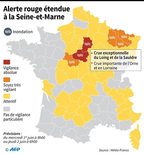 Le Loiret et la Seine-et-Marne se trouvaient toujours en alerte rouge inondations et sept autres départements du Centre et de Lorraine étaient en vigilance orange (Indre-et-Loire, Cher, Loir-et-Cher, Indre, Meuse, Meurthe-et-Moselle et Moselle).
