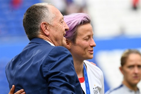 | Accolade entre Jean-Michel Aulas et la capitaine Megan Rapinoe après la finale du Mondial remportée par les Américaines à Lyon, le 7 juillet. |