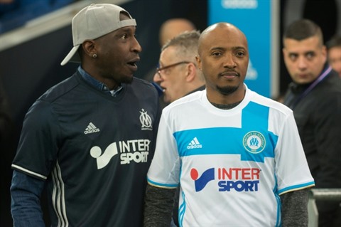 | Le rappeur Soprano et l'attaquant de l'OM, Mamadou Niang, lors du match contre le Paris Saint-Germain au stade Vélodrome le 26 février 2017. |