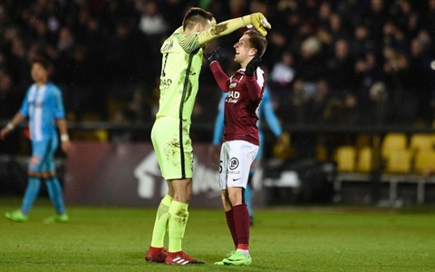 | La joie des Messins Thomas Didillon et Ivan Balliu après le but de Metz face à l'OM, le 3 février au stade Saint Symphorien. |