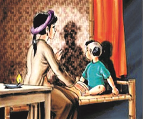 Une nuit, un orage éclata, le tonnerre se mit à gronder violemment, et un violent courant d’air éteignit la flamme du lumignon. L’enfant, endormi, sursauta brusquement et se mit à pleurer très fort. La jeune femme serra vivement l’enfant et le prit dans ses bras, ralluma la petite mèche, voyant son enfant toujours pleurer, elle montra son ombre sur le mur en bambou, et consola l’enfant en disant : "Tais-toi ! Mon enfant, n’aie pas peur, ton père est ici".