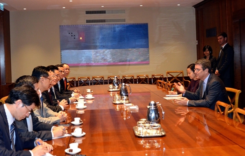 | Le directeur général de l'Organisation mondiale du commerce Roberto Azevedo (droite) lors d'une rencontre avec le vice-ministre permanent des Finances, Nguyên Công Nghiêp, le 21 octobre en Suisse. |
