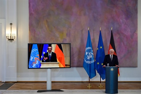 Le président allemand Frank-Walter Steinmeier (droite) participe à une conférence de presse par visioconférence avec le directeur général de OMS, Tedros Adhanom Ghebreyesus, à Berlin le 22 février. Photo : AFP/VNA/CVN |