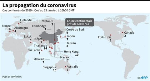 | Carte montrant les pays et territoires où des cas du virus chinois ont été confirmés le 29 janvier à 16h00 GMT. |