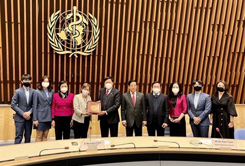 | La sous-directrice générale de l’OMS, Mariângela Simão (4e à gauche), le vice-ministre de la Santé, Dô Xuân Tuyên (5e à gauche), au siège de l’OMS à Genève, le 28 novembre. |