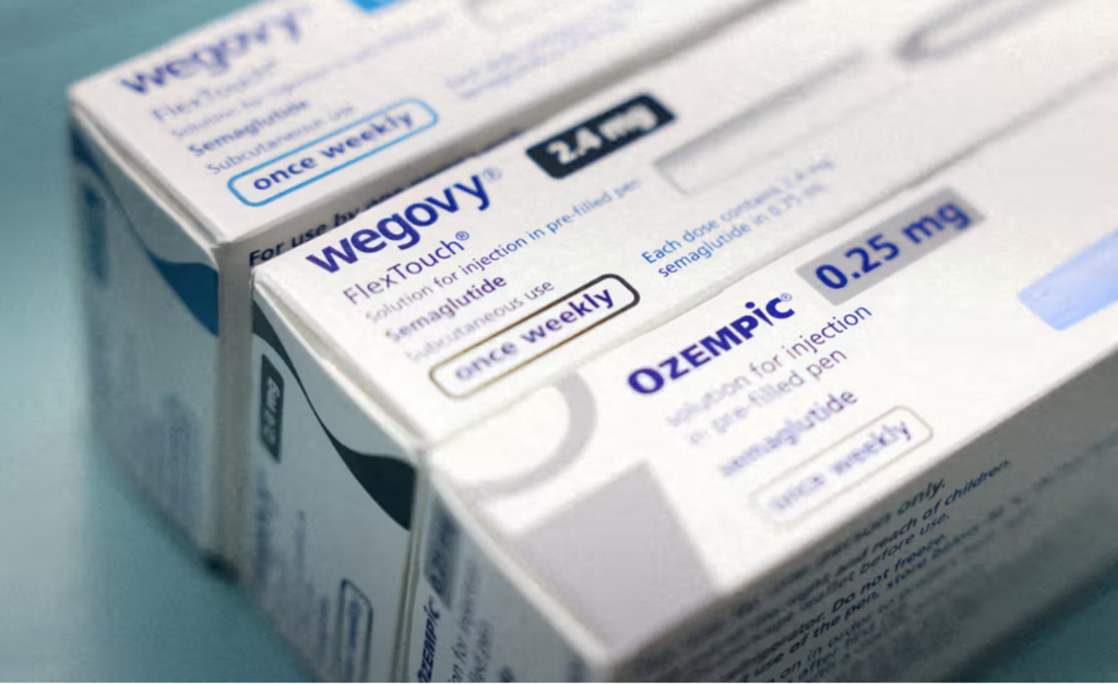 | Des boîtes d’Ozempic et de Wegovy, dans une pharmacie de Londres, le 8 mars 2024. |