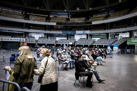 | Des personnes attendent dans le Palais des sports de Lyon (France), transformé en centre de vaccination, le 29 mars. |