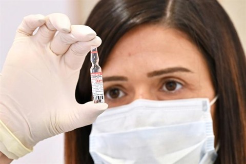 | Un soignant tenant un flacon du vaccin russe Spoutnik V contre le COVID-19, lors d'une campagne de vaccination à l'hôpital de Cailungo, à Saint-Marin, le 29 mars. |