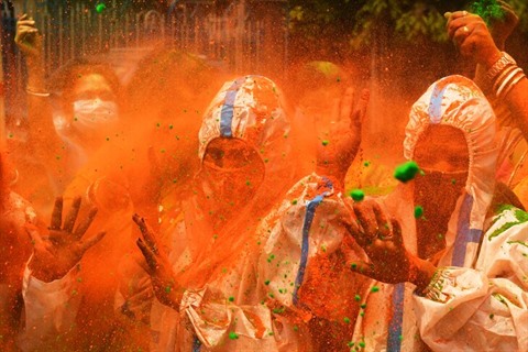 | Des gens se protègent du COVID-19 avec des combinaisons pendant les célébrations de Holi, la fête des couleurs en Inde, au cours de laquelle il est de tradition de s'asperger de pigments de couleurs, à Kolkata, le 29 mars. |
