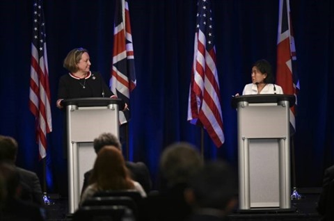 | La représentante américaine au Commerce Katherine Tai(droite) et la ministre britannique au Commerce international Anne-Marie Trevelyan au cours d'une conférence de presse à Baltimore le 22 mars. |