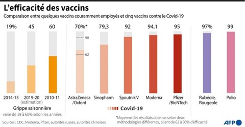 | Comparaison de l'efficacité de vaccins conventionnels et de cinq vaccins contre le COVID-19, alors que la Chine a annoncé que le vaccin développé par Sinopharm était efficace à 79,3%. |