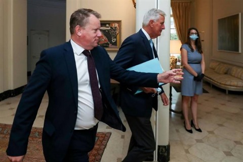 | Les négociateurs britannique David Frost, à gauche, et européen, Michel Barnier, à Bruxelles le 21 août. |