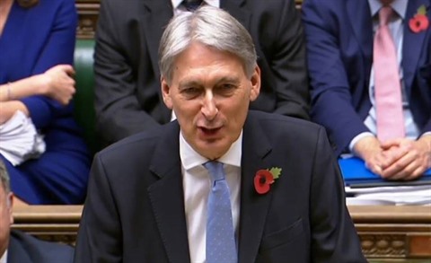 | Capture d'écran d'une vidéo fournie par le Parlement britannique montrant le ministre britannique des Finances, Philip Hammond, à Londres le 29 octobre. |