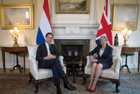 | Theresa May et Mark Rutte, le 21 février à Downing street, à Londres. |