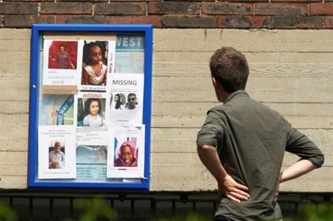 | Des photos de personnes disparues placardées près du site de l'incendie de la tour Grenfell, le 20 juin à Londres. |