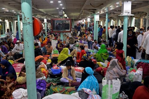 | Des voyageurs s'entassent sur un ferry à Dhaka, au Bangladesh, pour rentrer chez eux, le 4 avril. |