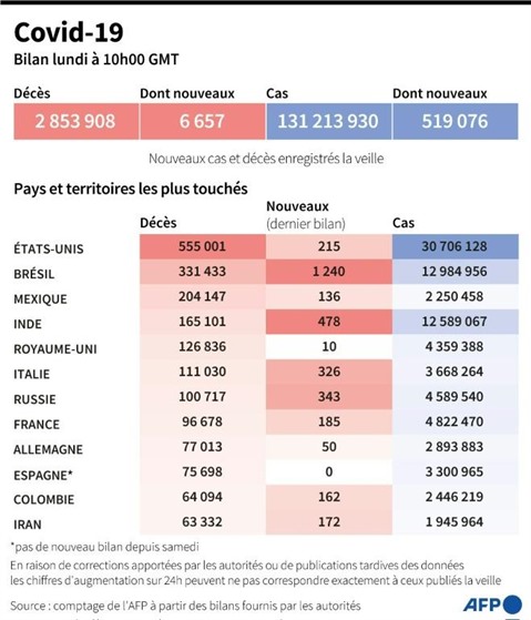 Les autorités saoudiennes ont quant à elles indiqué que seules les personnes vaccinées ou immunisées seront autorisées à faire le petit pèlerinage (omra) à La Mecque durant le mois du ramadan, qui commence à la mi-avril. À l'inverse, le Premier ministre britannique Boris Johnson, encouragé par l'amélioration de la situation au Royaume-Uni, a confirmé la réouverture le 12 avril en Angleterre des commerces non essentiels comme les coiffeurs, des terrasses des pubs ou des salles de gyms.