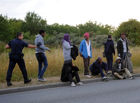 | Des migrants près du terminal d'Eurotunnel, le 2 août à Calais. |