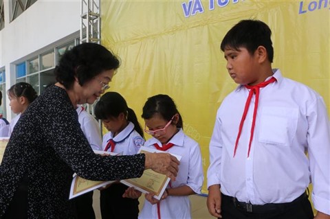 | L’ancienne vice-présidente de la République, Truong My Hoa, remet des bourses d'études aux élèves en difficulté, le 21 août à Long An (Sud). |
