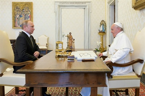 | Photo diffusée par le service de presse du Vatican montrant le président russe Vladimir Poutine (gauche) avec le pape François le 4 juillet lors d'une visite au Vatican. |