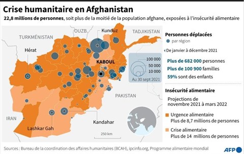 | Carte des projections sur l'insécurité alimentaire dans les provinces d'Afghanistan entre novembre 2021 et mars 2022 et localisation des personnes déplacées à l'intérieur du pays. |