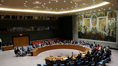 | Les membres du Conseil de sécurité de l'ONU votent une résolution prévoyant de nouvelles sanctions contre la Corée du Nord, le 5 août 2017 à New York. |