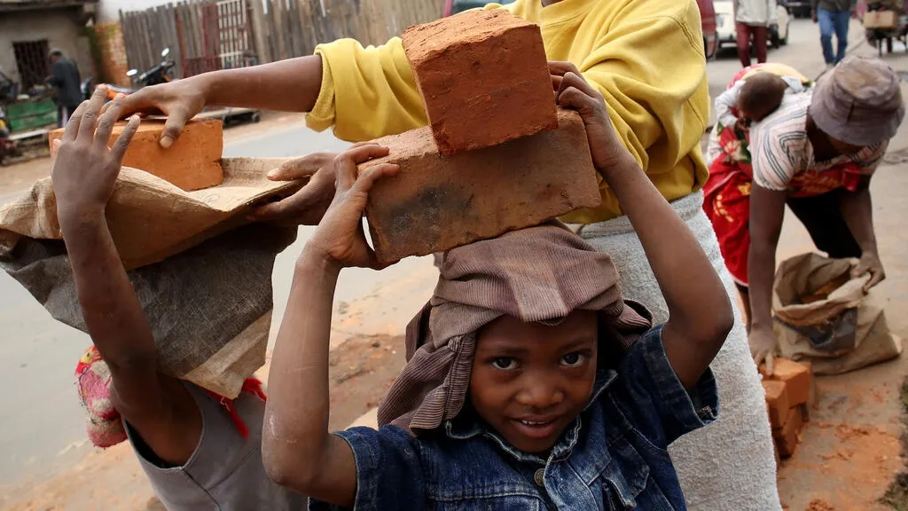 | Des enfants travaillent à transporter des briques, à Madagascar, le 19 décembre 2013. |