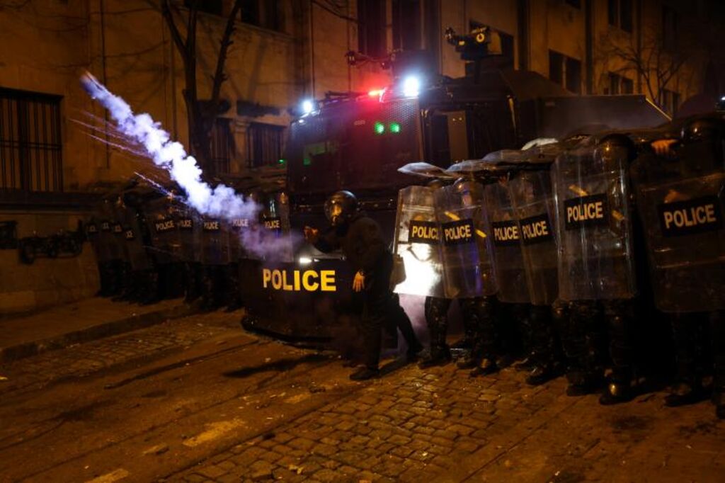 | Des policiers face aux manifestants lors de la cinquième nuit consécutive de mobilisation contre le report des négociations d'adhésion à l'UE, dans le centre de Tbilissi, en Géorgie, le 2 décembre 2024. |