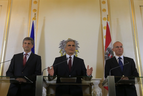 | Le chancelier autrichien Werner Faymann (centre), le ministre autrichien des Affaires étrangères Michael Spindelegger (gauche) et celui de la Défense, Gerald Klug (droite), lors d’une conférence de presse pour annoncer le retrait de ses troupes sur le Golan, le 7 juin à Vienne |