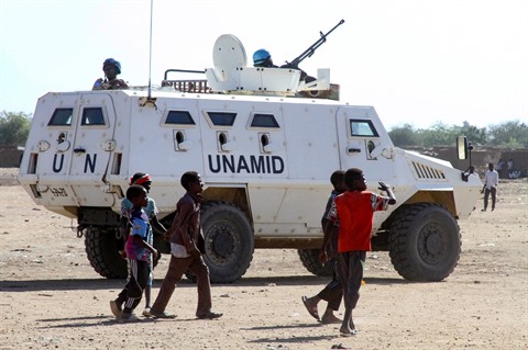 | Des enfants devant un véhicule blindé de la Mission de paix conjointe de l'ONU et de l'Union africaine au Darfour dans le camp de déplacés de Kalma, la capitale du Darfour-Sud, dans l'Ouest du Soudan. |