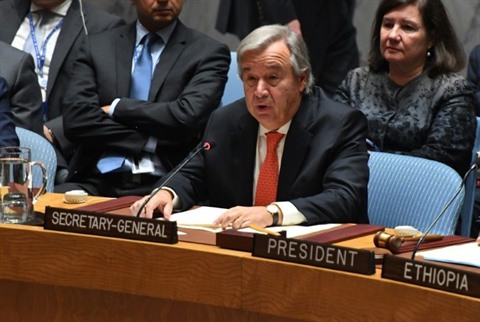 | Le secrétaire général de l'ONU, Antonio Guterres, le 28 septembre au Conseil de sécurité, à New York. |