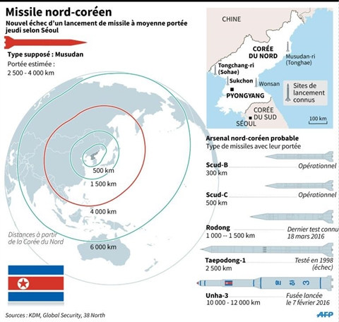 La RPDC a lancé le 28 avril un missile à portée intermédiaire de type Musudan, mais le lancementaurait apparemment échoué, a annoncé le ministère de la Défense de la République de Corée.
