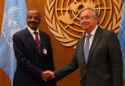 | Le secrétaire général des Nations unies Antonio Guterres (droite) et le ministre des Affaires étrangères de l'Érythrée, Osman Saleh Mohammed, à l'ONU à New York, le 27 septembre. |