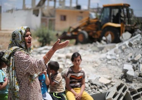 | Des Palestiniens font des travaux pour enlever les ruines d'immeubles détruits lors de la guerre à Gaza en 2014, dans le village de Khuzaa. |