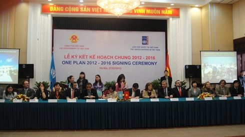 | Cérémonie de signature du plan de coopération 2012-2016 entre les représentants du ministère du Plan et de l'Investissement, de 16 organisations de l'ONU et de l'OIM, le 27 mars à Hanoi. Photo : Hà Minh/CVN |