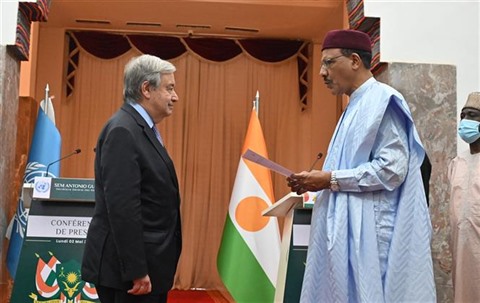 | Le secrétaire général de l'ONU, Antonio Guterres (gauche), et le président nigérien Mohamed Bazoum, le 2 mai à Niamey. |