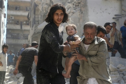 | Une fillette secourue des décombres par un secouriste et un volontaire après une frappe aérienne sur un quartier de la ville syrienne d'Alep, le 10 septembre 2016. |