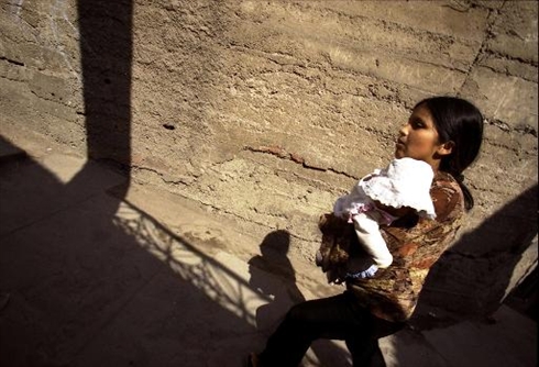 | Une jeune Péruvienne de 14 ans avec sa fille, près de Lim |