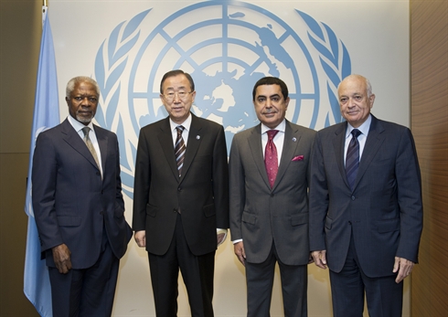 | De gauche à droite : l'émissaire international Kofi Annan, le secrétaire général de l’ONU, Ban Ki-moon, le président de l’Assemblée générale, Narrie Abulaziz Al-Nasser, et le secrétaire général de la Ligue arabe, Dr. Nabil El-Araby, le 7 juin à New York. Photo : AFP/VNA/CVN |