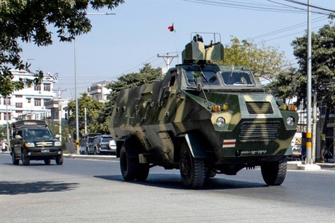 | Des véhicules militaires dans les rues de Mandalay, le 2 février au Myanmar. |