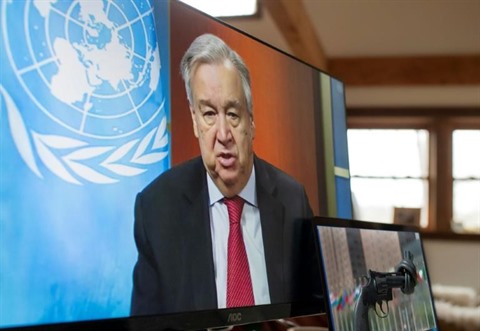 | Le secrétaire général de l'ONU, Antonio Guterres, lors d'une visioconférence, le 3 avril. |