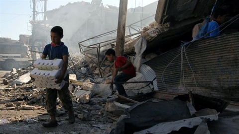 | Des enfants sauvent ce qu'ils peuvent après un bombardement dans l'Est d'Alep. |