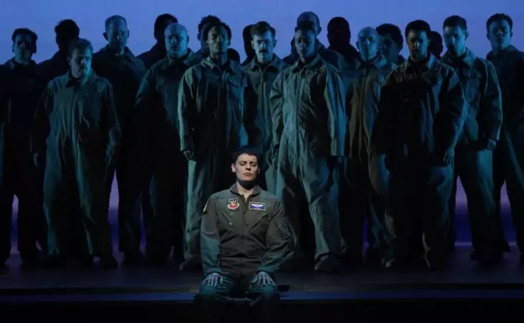 | Emily D'Angelo (au centre) dans le rôle de Jess pour l'œuvre +Grounded+ au Metropolitan Opéra de New York, le 19 septembre 2024. |