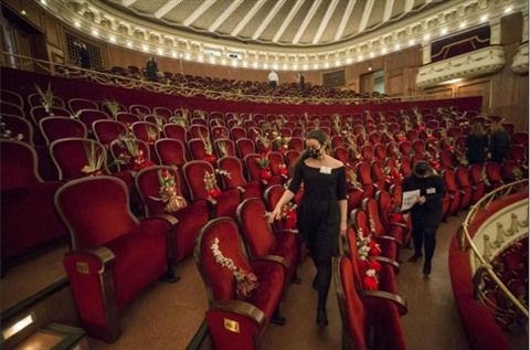 | Des bouquets de fleurs artificielles déposés sur les sièges pourpres qui doivent rester vacants, le 18 février, à l'Opéra de Sofia, en Bulgarie. |
