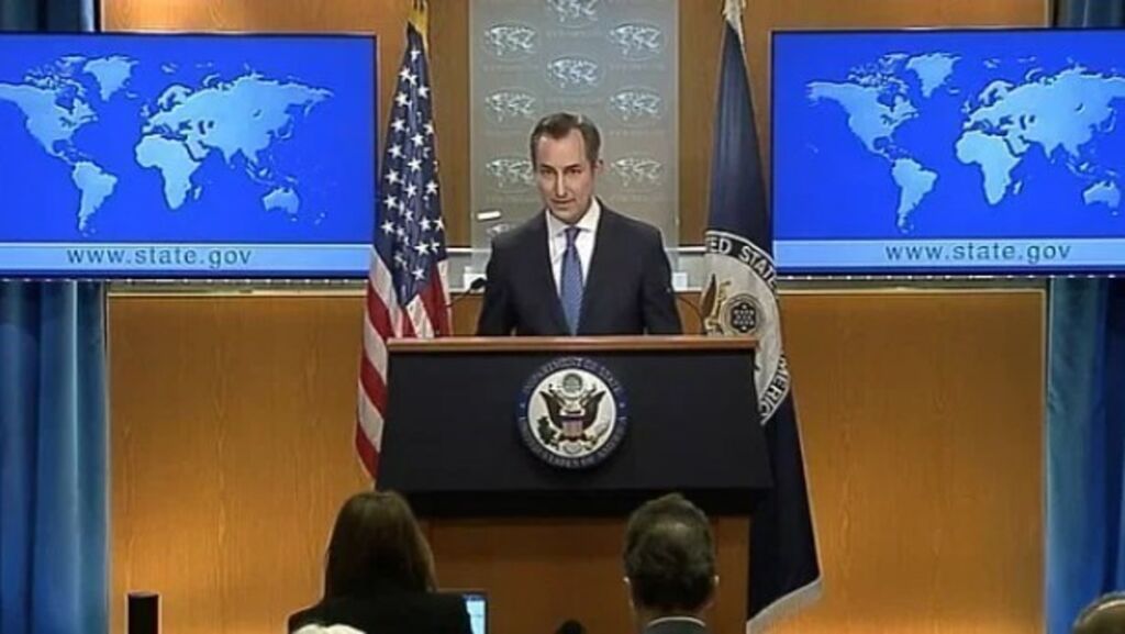 | Le porte-parole du département d'État américain, Matthew Miller, lors d'une conférence de presse à Washington DC. |