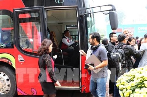 | Les bus Hanoi City tour assurent le transport des journalistes pour découvrir Hanoï. |