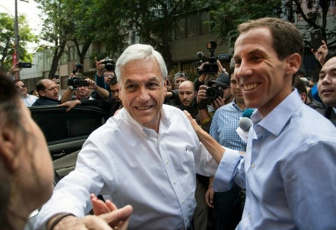 | À Santiago, l'avocat de droite Felipe Alessandri (droite), aux côtés de l'ex-président chilien, Sebastian Pinera, est parvenu à faire échec à la maire sociale-démocrate Carolina Toha, qui a reconnu sa défaite. |