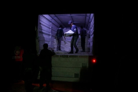| Livraison d'aide humanitaire de l'ONU dans la ville syrienne de Saqba, en banlieue de Damas, le 4 mars |