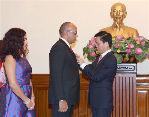 | Le vice-ministre vietnamien des Affaires étrangères Hà Kim Ngoc (droite) remet l’Ordre de l’Amitié du gouvernement vietnamien à l’ambassadeur cubain Hermenio Lopez Diaz. |